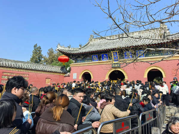 2月17日,丙午马年正月初一,周口市淮阳区太昊伏羲陵文化旅游区香火鼎盛、人流如织,处处洋溢着浓浓的年味。自除夕晚9时至初一上午,景区已接待游客十余万人次。民众络绎不绝前来祈福许愿,在热闹喜庆的氛围中共迎马年新春。记者 王映摄