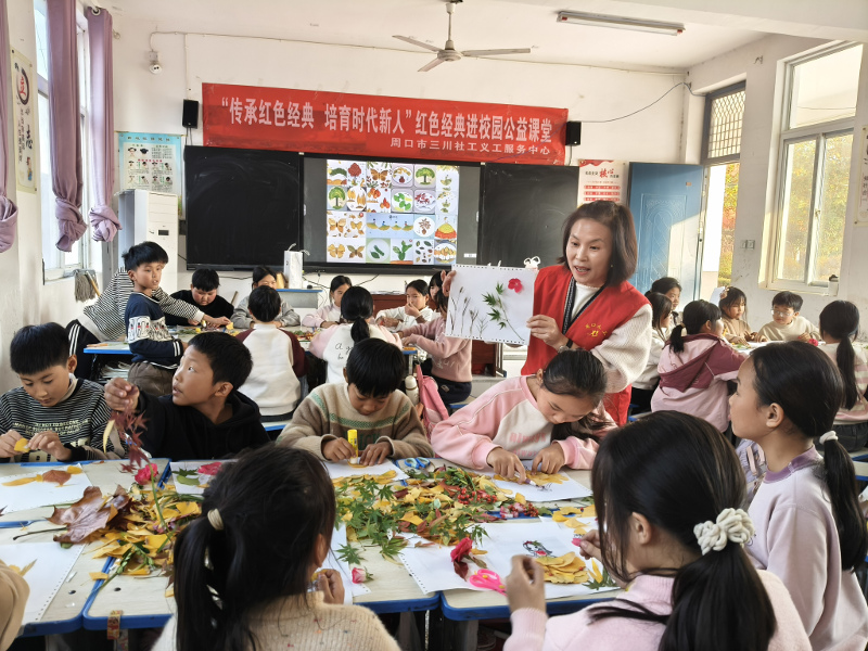 11月11日,周口市第十七初级中学小学部四(1)班教室里欢声笑语不断,一场由周口市三川社工义工服务中心精心策划的“树叶变变变”创意手工画活动在这里举行。活动中,孩子们化身“小小艺术家”,把秋天装进了画框里。记者 窦娜 摄